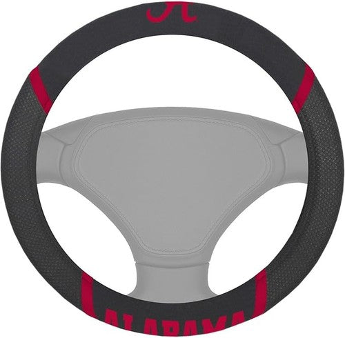 Add a special accent to your drive with a Embroidered Steering Wheel Cover from Sports Licensing Solutions. Our covers are made with a combination of faux suede and fabric mesh they make the perfect accent to any interior. Not only does the suede and mesh add a touch of style, but also gives you extra grip while keeping your hands warm in the winter and cool in the summer. There are 2 logos on the cover the team’s primary logo is embroidered on the top and then teams name is on the bottom. We embroider the logos so that they will not peel or fade after use while driving. With a 15 inch diameter the covers are compatible with most vehicles, just set in the sun to soften the rubber core before installation. Officially licensed by the NCAA to FANMATS.