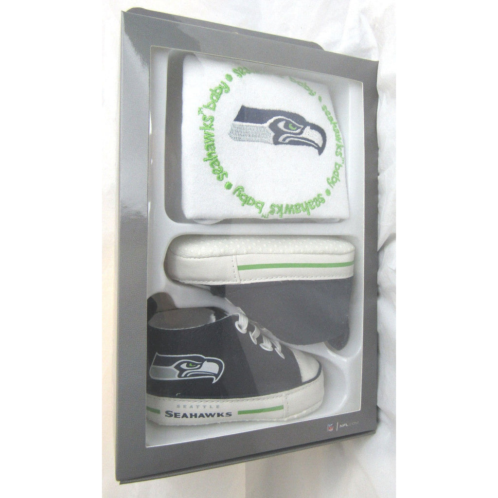 This Bib and Shoe gift set will have your little one on the path to outstanding Seattle Seahawks devotion. It features a bib with a hook and loop closure and embroidered team graphics. This set also has adorable old-school style shoes with the team name and logo printed on the sides, so your baby can boast serious Seattle Seahawks style!