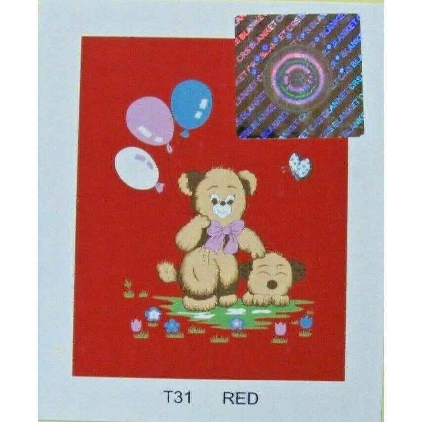 Girl with pink bow next to dog soft Minky 2ply throw blanket red background measures about 54" long by 39" wide. By POPTEX.