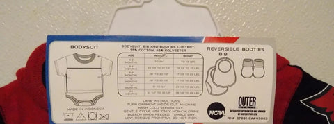 From kickoff to the final seconds of the game, the tiniest member of the squad will be looking sporty dressed in this NCAA-themed 3-piece set. This set comes with everything she need to show support of his favorite team! A coordinated short sleeve bodysuit, bib, and booties are all included. Made from cotton/poly blend interlock fabric, these baby essentials will keep him cool and comfortable all day long. The higher-in-the-front bottom snap closure gets mom and baby back to the big game faster, while an expandable lap shoulder neckline makes dressing less of a chore. Bib features soft neck closure for comfortable fit and coordinating cap completes the set. The easy care fabric keeps post-game cleanup to a minimum. Licensed to and made by OUTER Stuff
