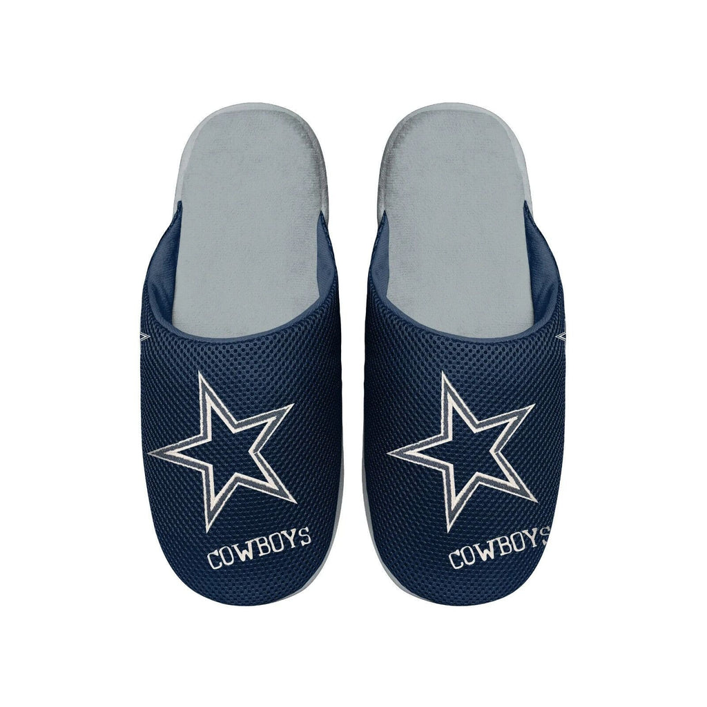 These plush slide slippers feature a large embroidered team logo on top center on mesh slipper. Non-skid rubber sole. Surface washable. Fiber content: outer shell 100% polyester. Inner: polyester fiber. Fill: 50% polyethylene foam, 50% polyurethane foam. Listing is for one (1) pair of slippers. Made by Forever Collectible (FOCO). Hanger not included. Size: Medium Men's Shoe Size 9-10.