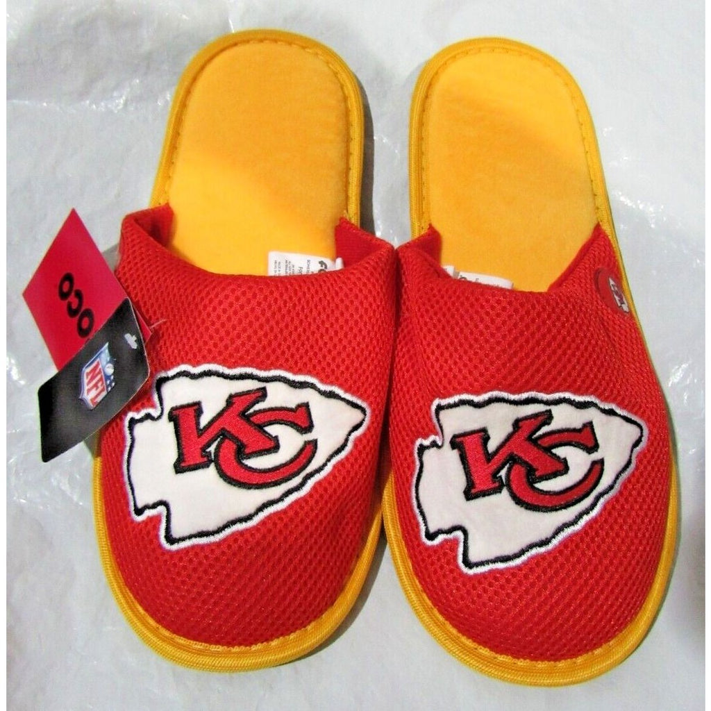 These plush slide slippers feature a large embroidered team logo on top center. Non-skid rubber sole. Surface washable. Fiber content: outer shell 100% polyester. Inner: polyester fiber. Fill: 50% polyethylene foam, 50% polyurethane foam. Listing is for one (1) pair of slippers. Made by Forever Collectible (FOCO). Hanger not included. Size: X-Large Men's Shoe Size 13-14.