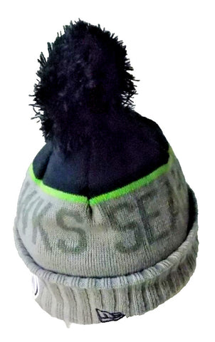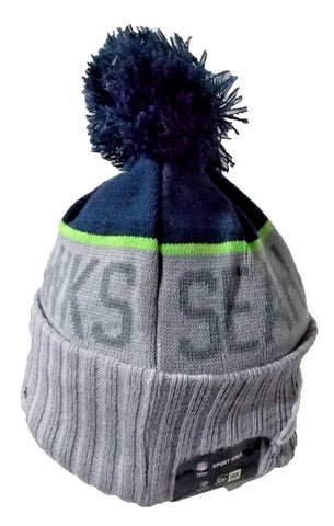 NWT NFL Seattle Seahawks name in solid dark gray on gray with blue pompom. Knit Beanie Adult Solid colors dark gray, blue, neon green gray and white Official Sideline Sport.