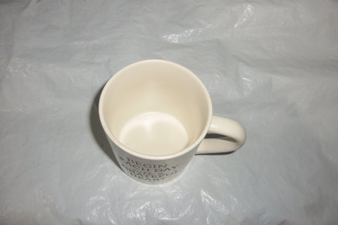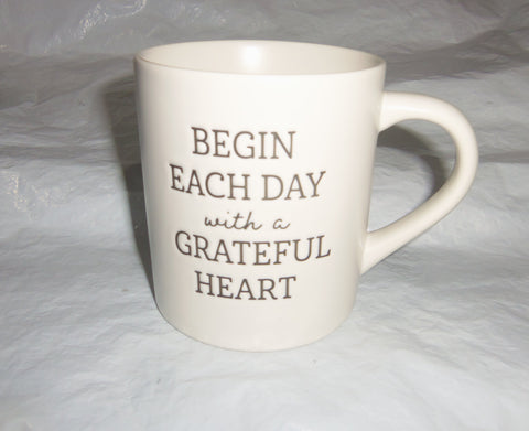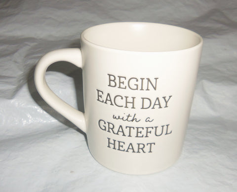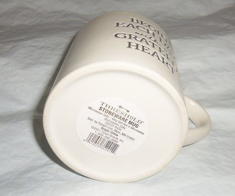 Begin Each Day with a Grateful Heart on 2 sides of 16oz white coffee mug Threshold Stoneware. Measures 4" tall, 5 1/4" wide including handle, 3 1/2" diameter top and bottom.