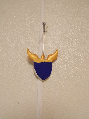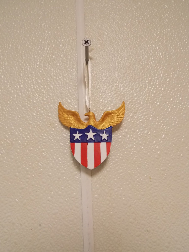 Christmas Tree Ornament American Pride Shield Under Eagle Hallmark. Comes ready to hang on a white ribbon. Ornament is for indoor use only. Measures about 2 1/2" tall, 3" wide and 1/4" deep. Made by Hallmark, made of resin.