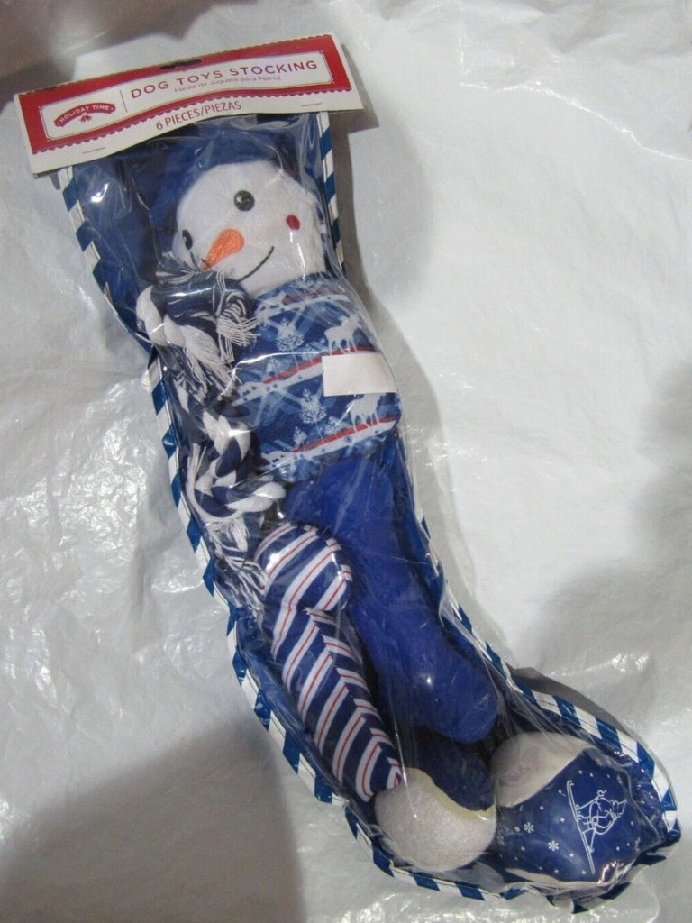 Dark blue dog toy stocking including 2 Plush Toys, 2 Balls, 1 Rope and 1 Squeak Toy made by Holiday Time.