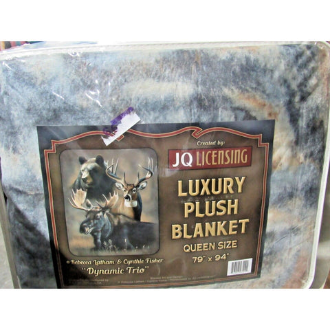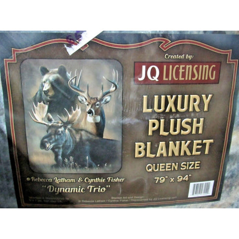 Black Bear, 10 Point Deere and Moose "DYNAMIC TRIO" (C) by Rebecca Latham and Cynthie Fisher Luxury Plush Blanket Queen 79"x94". Black Bear, Deere and Moose "DYNAMIC TRIO" (c) by Rebecca Latham and Cynthie Fisher Created by: JQ LICENSING, Luxury Plush Blanket Queen 79"x94".
