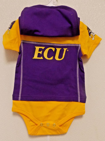 From kickoff to the final seconds of the game, the tiniest member of the squad will be looking sporty dressed in this NFL-themed 3-piece set. This set comes with everything she need to show support of his favorite team! A coordinated short sleeve bodysuit, bib, and booties are all included. Made from cotton/poly blend interlock fabric, these baby essentials will keep him cool and comfortable all day long. The higher-in-the-front bottom snap closure gets mom and baby back to the big game faster, while an expandable lap shoulder neckline makes dressing less of a chore. Bib features soft neck closure for comfortable fit and coordinating cap completes the set. The easy care fabric keeps post-game cleanup to a minimum.