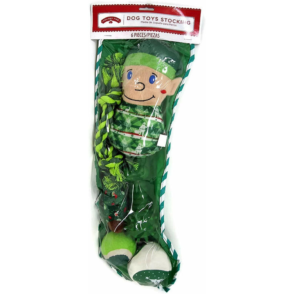 Green Dog Toy Stocking 2 Plush Toys 2 Balls 1 Rope 1 Squeak Toy Holiday Time
