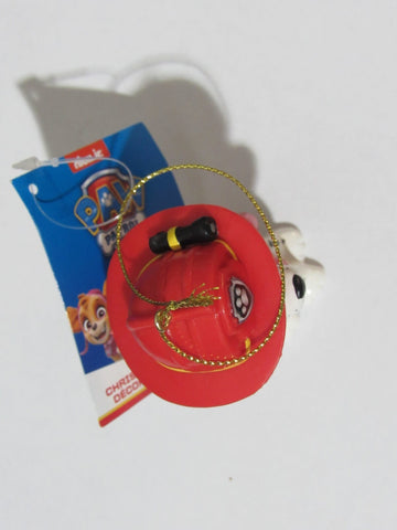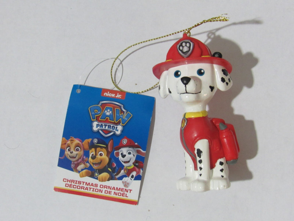 Paw Patrol Marshall sitting Christmas tree ornament, 3-dimensional, measures approx: 3 1/2" tall, 1 3/4" wide and 1 3/4" deep. Materials: resin, comes ready-to-hang with a gold cord, by Kurt S. Adler.